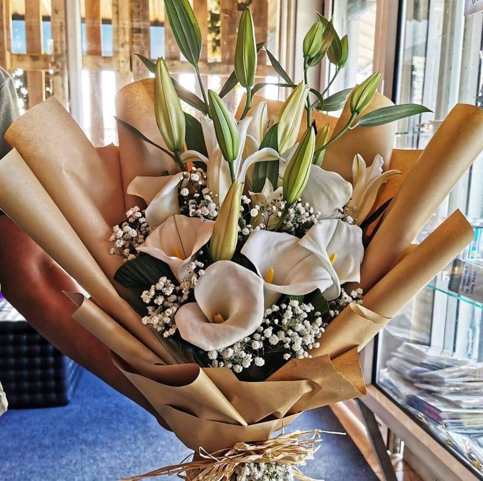 A refined bouquet featuring white calla lilies and fresh greenery wrapped in premium paper. Perfect for special celebrations.