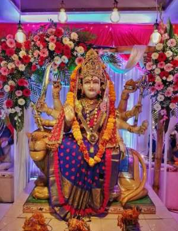 Beautiful flower decoration for Durga prayer ceremonies and religious celebrations.
