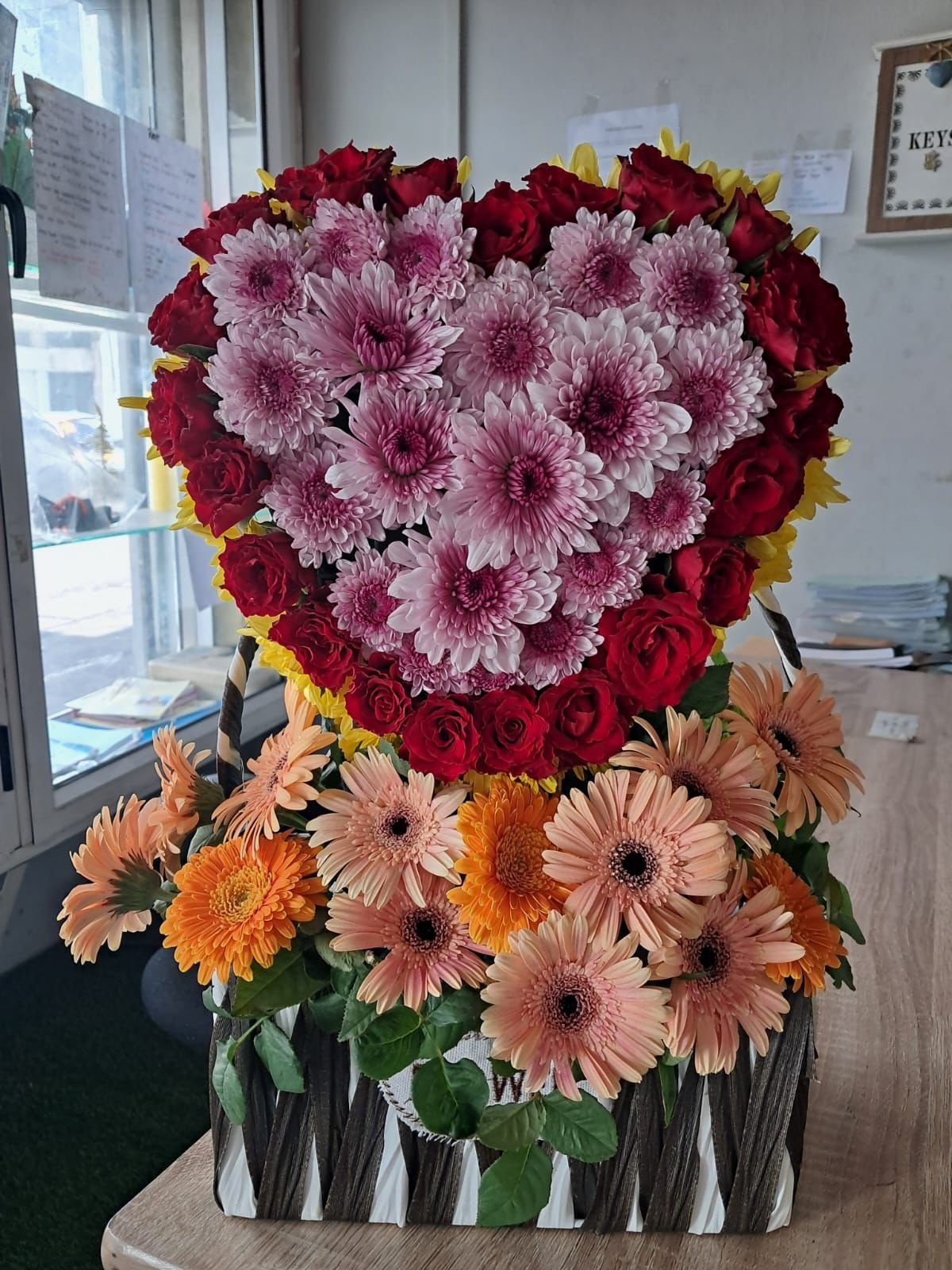A large heart-shaped standing floral arrangement designed to create a memorable visual impact. Perfect for romantic celebrations and special events.