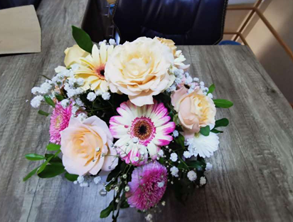 Delicate arrangement of pastel roses and fillers ideal for intimate settings.