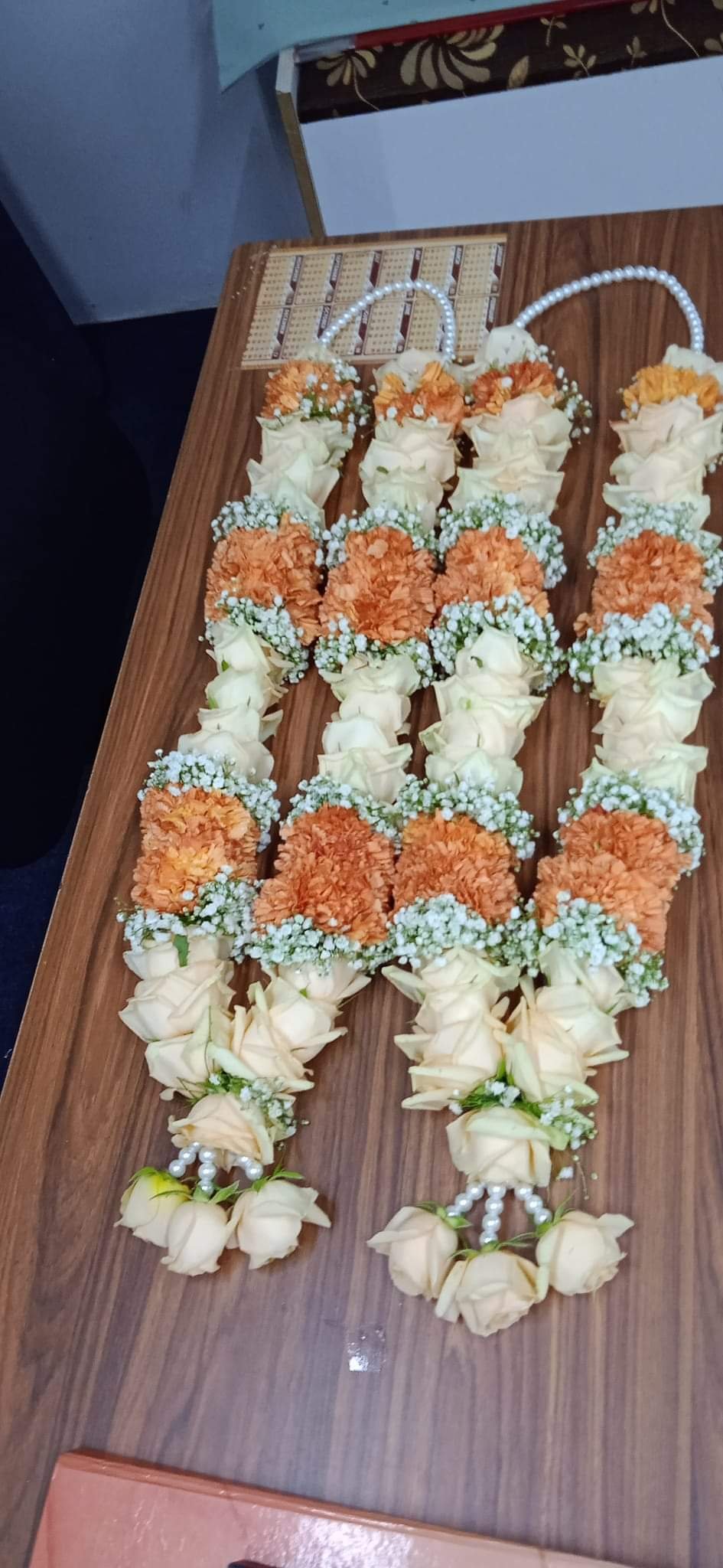 Soft colored floral garland designed for wedding exchanges.