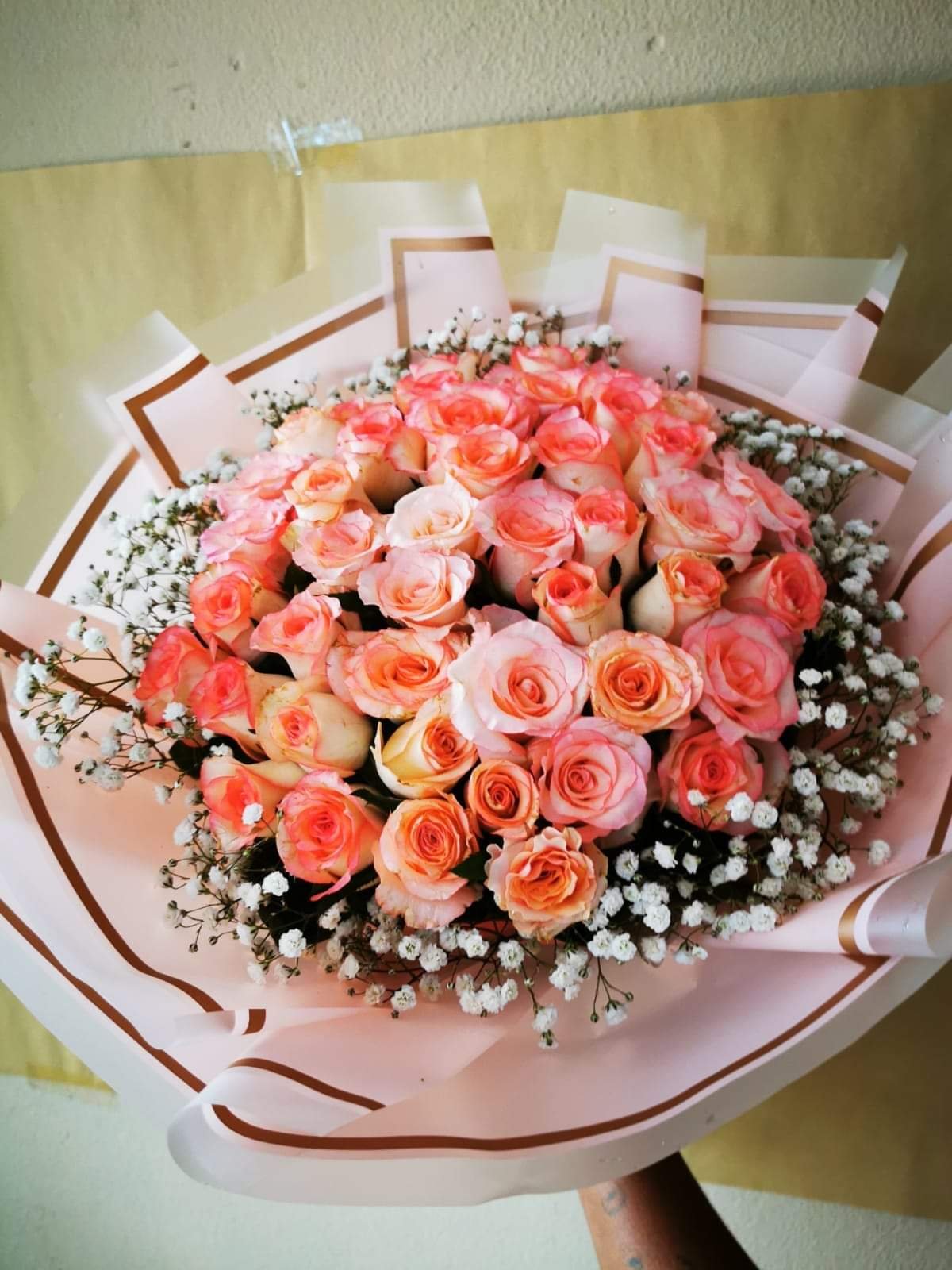 Soft pink rose bouquet arranged with baby’s breath.