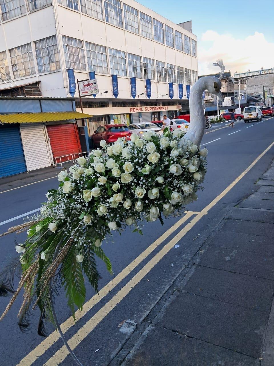 Standing floral arrangement for prayer ceremonies.