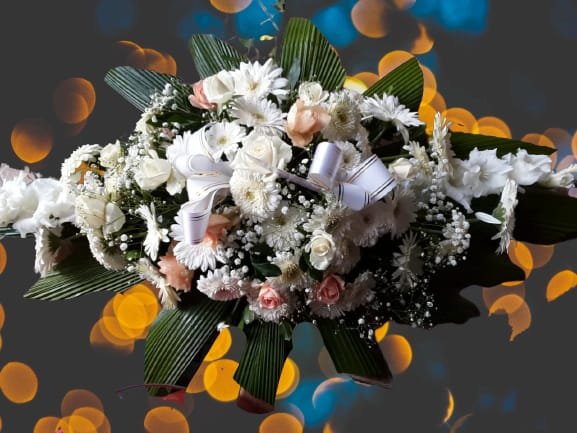A delicate arrangement of white flowers symbolizing peace, respect and remembrance.
